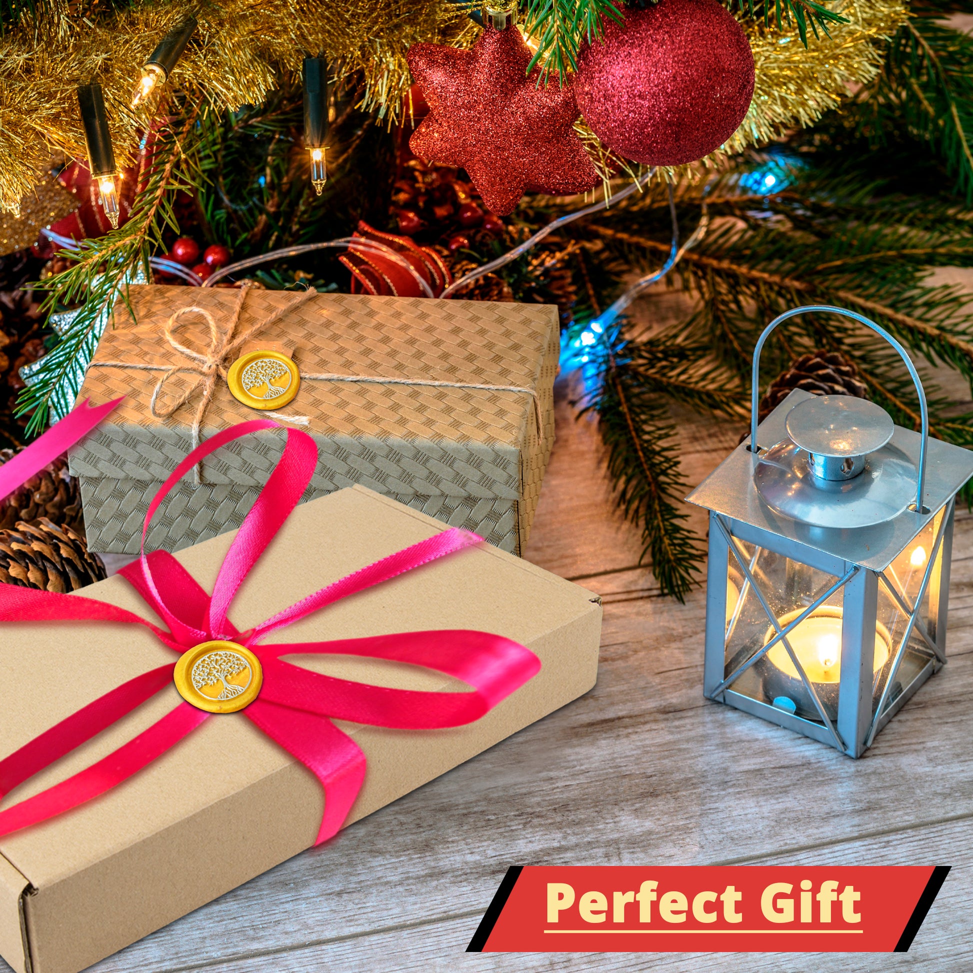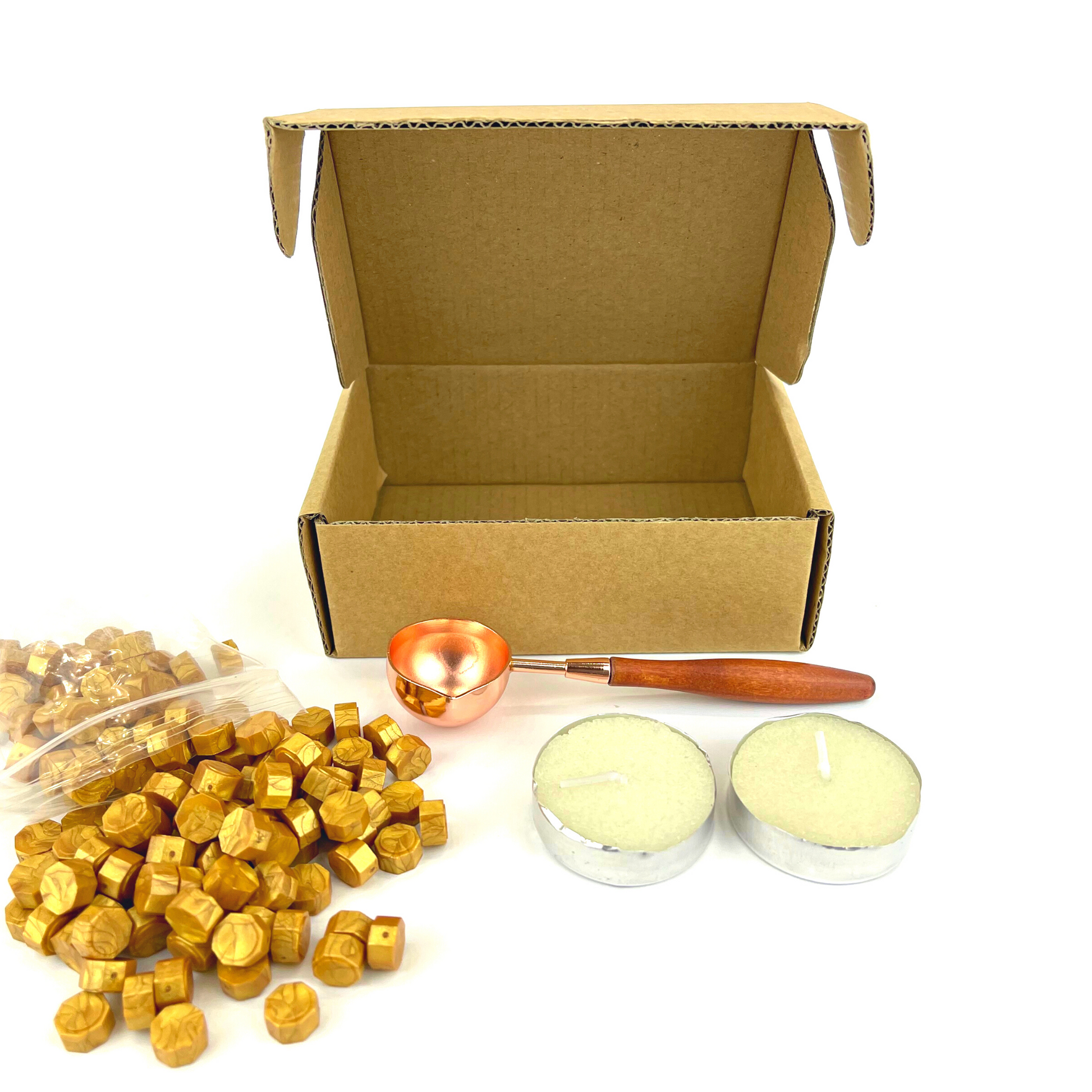 WAX STAMP KIT Trustela's wax seal stamp kit comes with 150 pieces of sealing wax beads in a golden color, sealing wax melting spoon and 2 tealight candles.